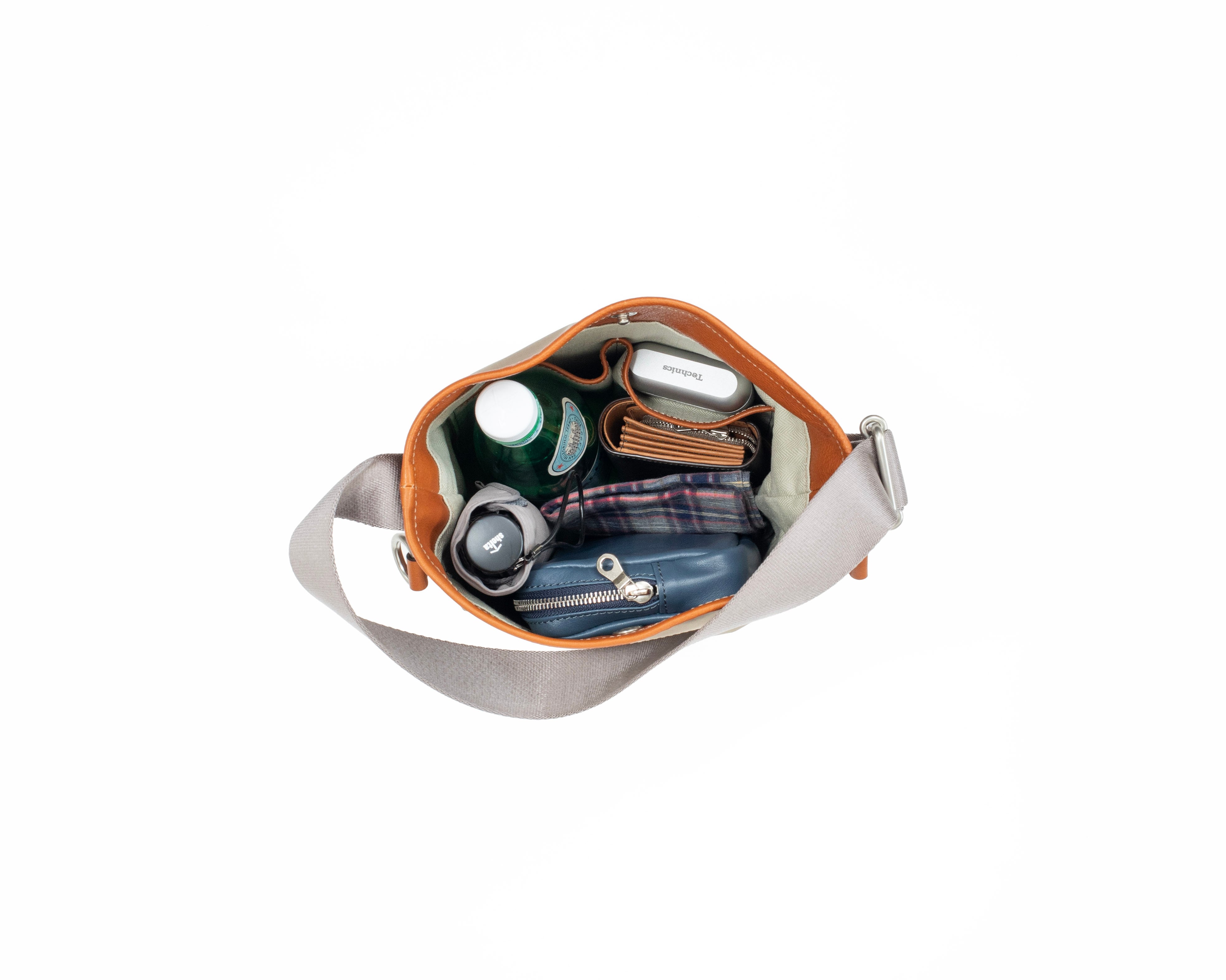 ミニサイズながら、財布や携帯やポーチそして500mlのペットボトルや小さめな折り畳み傘も収納可能。ホック式の開閉で、出し入れもしやすい。手提げは勿論、ベルトを調整すれば肩掛け。そして脱着可能な付属のショルダーベルトで斜め掛けで持つことも出来ます。