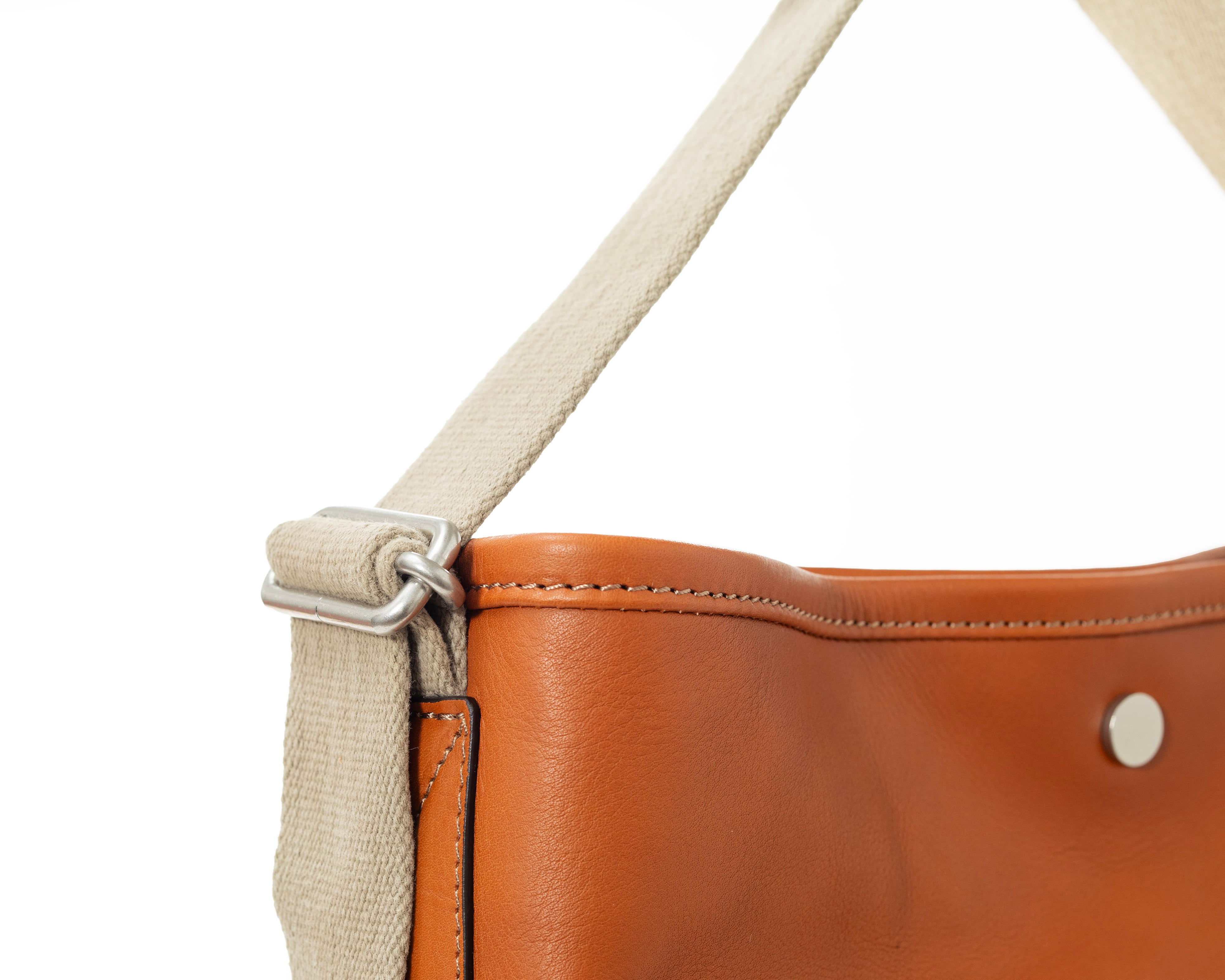 肩に掛けた時にスマートな印象になる様、絶妙な縦横のバランスでデザインしたワンショルダーバッグ。あえて外側にポケットをつけずシンプルにした訳は、開口部が大きく開き、ホック留なので荷物の出し入れがしやすい為。ショルダーベルトは調節可能で、短くすると口元が自然にクッタリと落ちるのが良い感じに。