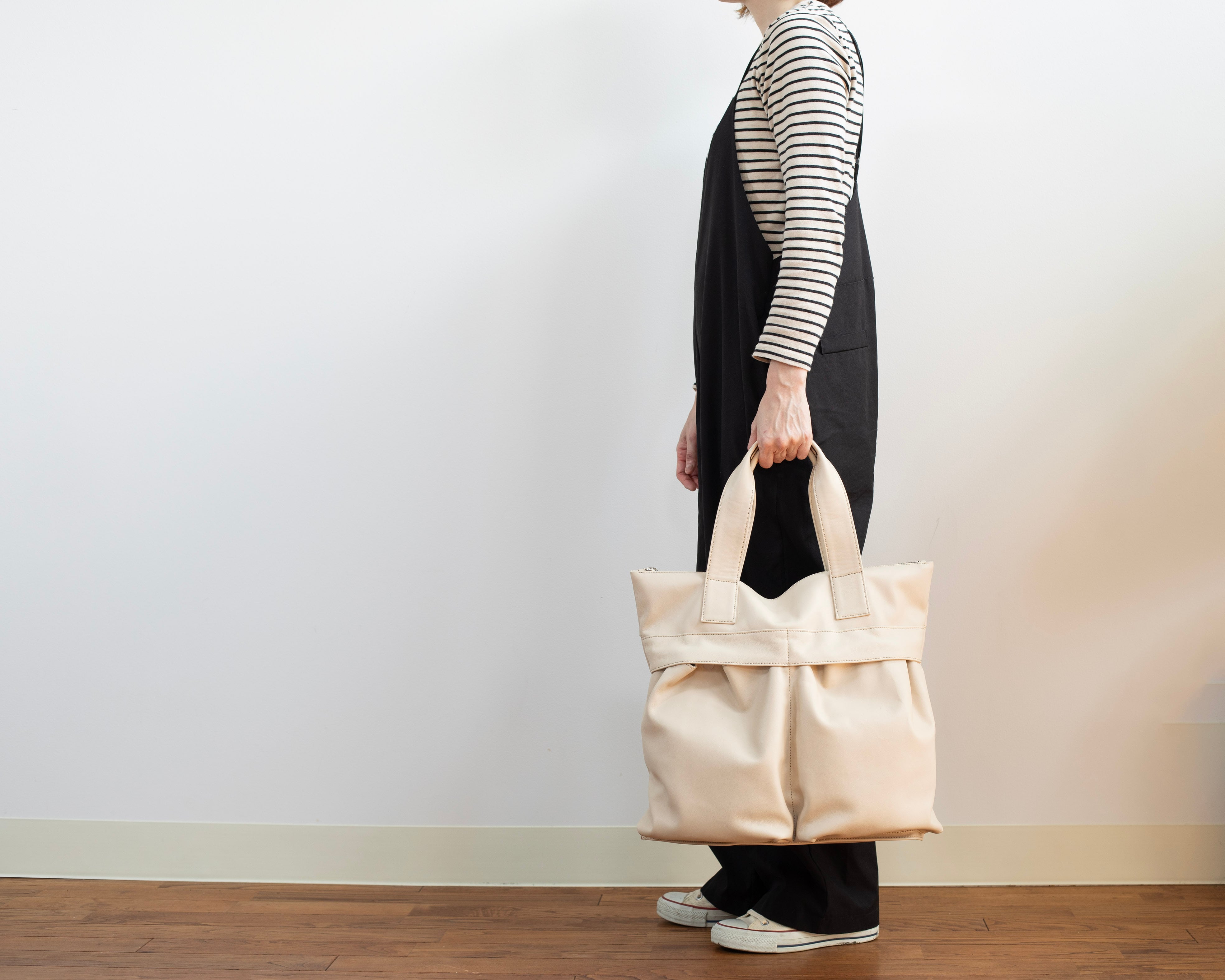 その日の着こなしを崩さぬように、ハンドルはギリギリ肩からも掛けられるサイズにし、敢えてショルダーベルトは付けていない為、非常にシンプルです。